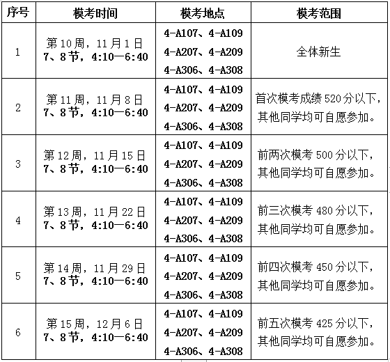 学院拟于11月1日开始,进行6次(暂定)四级模拟考试,请班主任助理组织好小班同学准时参考。具体时间安排如下: