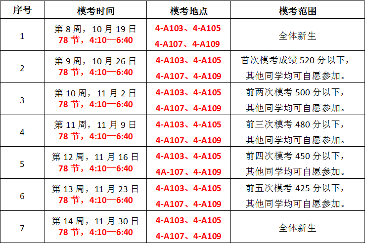 学习部将于10月19日开始,预计进行7次四级模拟考试,请班主任助理组织好小班同学准时参考。具体时间安排如下: